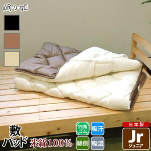 ■商品説明 ・40mmポリエステル固芯入なので、床付感なく1枚でご使用いただけます。 ・コインランドリーで洗濯できるので、清潔に使用していただけます。 ・「乾きやすい生地」、「洗っても固まらずふわふわな抗菌防臭防ダニ仕様の中綿」、洗いにこだわった敷布団です。 ・ほこりが出にくい合繊ワタ入です。ぜん息やアレルギー体質の方におすすめです。 〜縫製から加工まで眠り姫で行っております。〜 ■スペック 【サイズ】85×185cm(ジュニア) ※カバーサイズ:90×190cm【生地】ポリエステル65%・綿35% (205本ブロード)【中綿】抗菌防臭防ダニ(帝人マイティトップ)ポリエステル50%・抗菌防臭(帝人フィルケア)ポリエステル50%【中芯】ポリエステル固芯40mm【充填物量】約3.2kg【製品総重量】約3.8kg【厚み】約8cm【原産国】日本製 ■お手入れについて 天日干しをおすすめ。 コインランドリーで洗濯する際は、綿切れ防止のため、専用ネットを使用するか、ロール状に巻いてひも(おすすめはゴム)でしばって洗濯をお願いします。 しっかり乾かしてください。 ご使用はじめは、固芯が硬いので、折りたたむのが難しい場合もあります。 ■ご確認ください 【カットサンプル】 ・できるだけ実物と同じ色合いになるようにしていますが、モニターの環境上実物と色合いが異なる場合がございます。ご心配な場合は、色カット(小)サンプルを無料で送らせていただきます。ご連絡お願いします。 ・中素材についても、カット(小)サンプルをお送りいたします。送料はお客様のご負担となり着払いで発送をさせていただきます。ご了承くださいませ。ご入用の場合はご連絡お願いします。 【お願い】 ・仕上がりサイズ・厚み・製品総重量等は、おおよその数字です。お布団の性質上、確定の数字ではございません。ご了承願います。 ・商品は、小さく圧縮して梱包し送らせていただいています。届き次第の開封をお願いします。 ・ご注文いただいてから、加工いたします。お届けまで、お時間をいただく場合もございます。心をこめておつくり致します。できあがりまでお待ちくださいませ。 ・弊社による商品の不備がある場合は、返品お受けいたします。が、イメージとちがう、サイズを間違えた、モニターと色が違う等のお客様都合による返品交換はお受けできません。 ご購入前にご不明な点やご不安な事については、当ショップでにご連絡の上、ご相談、確認くださいませ。 上記の内容をご理解、ご了承の上、お買い求めくださいますようお願いいたします。