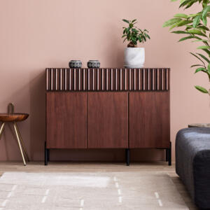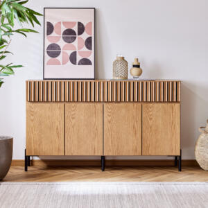 職人が磨き作業を行う格子模様が特徴的な幅110cmのサイドボードです。自然光や照明の当たり方によって陰影の変化を愉しめるデザインです。使い分けの出来る収納でお部屋もスッキリ片付きます。