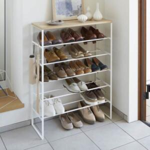 生活雑貨・キッチン雑貨・インテリアなどを中心としたデザイン性の高い商品で人気の山崎実業の「tower(タワー)」シリーズ。下駄箱からあふれた靴をまとめて収納できる天板付きシューズラック6段。男性のシューズなら約18足、女性のヒールなら約21足収納することができます。付属のフックが2個付いているので、靴べらや、折り畳み傘などの小物もまとめて収納できます。お部屋に馴染みやすいシンプルなホワイト色とブラック色からお選びいただけます。