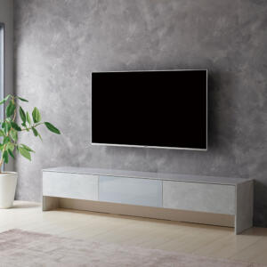 高級感のあるグラデーションが美しいテレビボード「デコレ」210 ダブ色。台輪はアルミミラーパネルを貼り、スクエアでモダンな仕上がりです。府中桐製家具/ロータイプ/70型まで/バスウッド材/TV設置部耐荷重: 80kg
