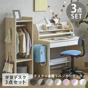 学習デスク 学習机 勉強机 3点セット ハンガーラック 子供 木製 子供用 収納 デスクセット 引出し付き セット コンパクト 子供部屋 足元収納 スライドレール 白 ホワイト ブラック 黒 グレー ピンク