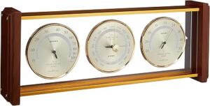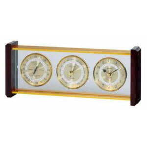 【内容】クリスタルな美しさ。ゴールド仕上げのアルミ枠の中に計器が浮かんでいます。温度計・湿度計は高精度スーパーEXセンサーを搭載し、材質、仕上げともワンランク上の商品です。【仕様】●品番:EX-743●サイズ:(約)H36.0xW14.3xD5.5cm●カラー:ゴールド●素材:(外枠材質)天然木、アルミ●電源:(電池)単3×1個●重量:約1100g●仕様:置・掛け兼用、(機能)温度計・湿度計・時計・気圧計●原産国:日本【送料について】北海道、沖縄、離島は送料を頂きます。