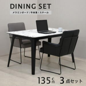 ダイニングテーブルセット 2人掛け 幅135cm メラミンボード 本革張り スチール脚 stm135-3-lca343pld 3点 ストーン柄 クッション レザー 肘掛け付き 取っ手 木製 テレワーク 北欧 モダン シンプル 32s-4k so mz