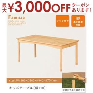 おすすめ・人気の商品■サイズ・色違い・関連商品■幅600mm■幅900mm■幅1100mm[当ページ]関連商品の検索結果一覧はこちら■商品内容キッズテーブル ナチュラル 【幅1100×奥行580×高さ440 mm】 組立品■商品スペック【商品サイズ】W1100×D580×H440 (470) mm【仕様】●天板:天然木 (パイン 20mm厚) ポリウレタン塗装●脚:天然木 (パイン φ40mm) ポリウレタン塗装●フック:天然木 (ラバーウッド) ポリウレタン塗装【耐荷重】天板:30kg 【機能】●天板の高さ調節時に不用になった継脚は天板の裏側に収納できます。●フックは左右に計2ヶ所。●天板高さ調節は継脚 (30mm)にて調節※こちらの商品はお客様による組立商品です。【ご注意事項】・商品の組み立て開始前に部材不足、破損がないか必ずご確認ください。・ご注文後のキャンセルはできかねます。・長期不在などにより持ち戻りとなった場合、掛かった費用を全額ご負担いただきますので、予めご了承ください。・本商品は、北海道・沖縄・離島への配送はいたしかねます。あらかじめご了承ください。■送料・配送についての注意事項●本商品の出荷目安は【1 – 4営業日 ※土日・祝除く】となります。●お取り寄せ商品のため、稀にご注文入れ違い等により欠品・遅延となる場合がございます。●本商品は仕入元より配送となるため、北海道・沖縄・離島への配送はできません。[ FAM-T110(NA) ]