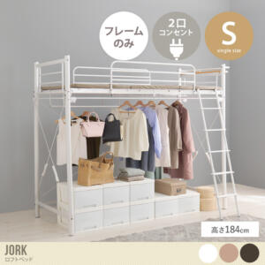 お好きなカーテンが取り付けられる高機能ロフトベッド「AQUA」正面とサイドにカーテンレール&リングが付いているので、急な来客時など、ベッド下をサッと隠したい時に大活躍。こちらは【ベッドフレーム単品販売】なので、ぜひ気に入ったカーテンを見つけて取り付けてみてください!付属品としてハンガーポールが4本付いているので、ベッド下にコートやスカート、バッグや小物を掛けてウォークインクローゼット風にすることも。さらに宮棚には1500Wまで使える2口コンセント付きなので、寝ながらスマートフォンやタブレットの充電をすることもできます。カラーはシンプルな「ホワイト」「ダークブラウン」と、姫系・韓国インテリアにも使える、可愛いアースカラーの「ヘーゼルブ
