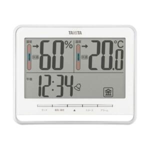 ■サイズ・色違い・関連商品■ブラック■ホワイト[当ページ]■商品内容●本体色はホワイトです。●温湿度に時間、曜日もひと目でわかる。●アラーム機能、スヌーズ機能付。●過去の最高・最低温湿度を表示。■商品スペック測定項目:温度、湿度表示項目:温度、湿度、時計(12時間)、カレンダー測定温度範囲:-5〜45℃測定湿度範囲:20〜95%寸法:W182×D25×H148mm重量:380g色:ホワイト電源:単4形乾電池×2本付属品:お試し用乾電池2本その他仕様:●設置方法:卓上・壁掛け兼用●測定方式:温度/サーミスタ、湿度/抵抗変化型湿度センサー●フック穴、スタンド付■送料・配送についての注意事項●本商品の出荷目安は【1 – 7営業日 ※土日・祝除く】となります。●お取り寄せ商品のため、稀にご注文入れ違い等により欠品・遅延となる場合がございます。●本商品は仕入元より配送となるため、沖縄・離島への配送はできません。[ TT-538WH ]