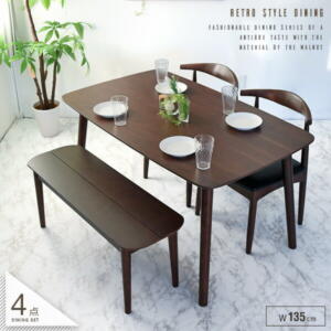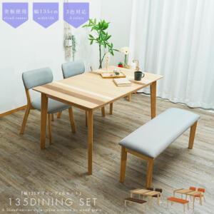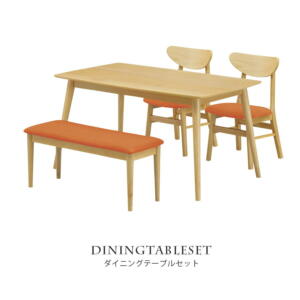 ■Product Details 丸みのあるデザインがかわいいダイニングテーブルセットです。 サイズ テーブル:幅135×奥行80×高さ70cm チェア:幅49×奥行53×高さ76(SH43)cm ベンチ:幅105×奥行35×高さ43cm 材質 テーブル 天板:オーク突板 脚:ラバーウッド チェア・ベンチ 張地:ファブリック 脚:ラバーウッド カラー テーブル:ブラウン ナチュラル チェア:ブラウン グレー オレンジ 仕様 生産国:ベトナム 発送状態 お客様組み立て品 シリーズ商品 送料 九州〜関東送料無料 備考 商品は、小売と併用しておりますので、常時在庫状況が変動いたします。 在庫欠品の際は、入荷までお時間を頂きます。配送は全て宅配便(1人)での玄関渡しとなります。 大型商品や重量商品、エレベーターの無い2階以上にお住まいのお客様は、玄関口までの搬入のお手伝いをお願いしております事をご了承ください。 大型商品はドライバー1人では荷降ろしができませんので必ず力のある方のお手伝いをお願いいたします。