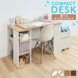 コンパクトデスクのみ、またはコンパクトデスク+キャビネットのセットを選べます。◇コンパクトデスク2種類のラックに、教科書や文房具などをお片付けできる収納付きデスクです。教科書やノートを広げても手狭にならない、ひろびろ天板。天板は傷や汚れに強い塩ビ化粧繊維板を採用しているので、お手入れ簡単です。コード穴があるのでデスク周辺もすっきり、壁にピッタリ設置できます。大人になっても使える、シンプルで飽きのこないデザインです。◇キャビネット1段目は鍵付きの使い勝手の良いキャビネットです。収納するものによって使い分けられる2段の引き出し、厚手の天板はランドセルも余裕で置けるサイズです。キャスター付きなので、移動やお掃除もラクラク。★お客様組立★◇コンパクトデスク●商品サイズ(cm)幅約114.5×奥行約57×高さ約73.4デスク(ラックB込み):幅約100×奥行約57×高さ約73.4ラックA:幅約29×奥行約59.1×高さ約70.9●商品重量約21kg●材質本体:プリント化粧繊維板天板:塩ビ化粧繊維板●耐荷重デスク:天板 20kgラックA:棚 各3kgラックB:棚 各5kg●組立時間めやす約90分◇キャビネット●商品サイズ(cm)幅約35.5×奥行約39.5×高さ約50●商品重量約6kg●材質本体:プリント化粧繊維板天板:塩ビ化粧繊維板●耐荷重(約)天板:10kg上段:3kg下段:7kg●組立時間めやす約40分(検索用:おしゃれ 学習デスク セット 机 キャビネット 子供家具 子供机 脇卓 収納付き 本棚付き 子ども こども リモートワーク 在宅 デスク )最強翌日配送対象商品に関するご案内 最強翌日配送対象商品・対象地域に該当する場合は最強翌日配送マークがご注文カゴ近くに表示されます。 最強翌日配送可能なお支払方法は【クレジットカード、代金引換、全額ポイント支払い】のみとなります。 下記の場合は最強翌日配送対象外となります。 ・15点以上ご購入いただいた場合 ・時間指定がある場合 ・ご注文時備考欄にご記入がある場合 ・決済処理にお時間を頂戴する場合 ・郵便番号や住所に誤りがある場合 ・最強翌日配送対象外の商品とご一緒にご注文いただいた場合 ・お届け先住所文字数が40文字以上の場合 関連キーワード(本商品の説明ではありません)母の日 父の日 敬老の日 こどもの日 クリスマス バレンタイン ホワイトデー ハロウィン お正月 成人の日 成人式 記念日 誕生日 卒業式 入学式 お歳暮 お中元 春 夏 秋 冬 梅雨 節分 ひな祭り 七夕 十五夜 初詣 年越し 夏祭り 花火大会 結婚祝い 内祝い 出産祝い 快気祝い 還暦祝い 古希 喜寿 傘寿 米寿 卒寿 白寿 百寿 新築祝い 引っ越し祝い 開店祝い 開業祝い 就職祝い 昇進祝い 合格祝い 銀婚式 金婚式 七五三 長寿祝い 御礼 お母さん お父さん 義母 義父 祖父 祖母 おばあちゃん おじいちゃん 娘 息子 彼氏 彼女 恋人 友達 上司 先輩 後輩 同僚 キッズ 子供 幼児 ベビー 赤ちゃん 育児 学生 社会人 シニア 10代 20代 30代 40代 50代 60代 70代 80代 90代 一人暮らし 単身赴任 主婦 主夫 新生活 家族暮らし 子育て 旅行 トラベル ライブ ホームパーティ ビジネス 法人 ギフト プレゼントLINEお友だち登録で★300円OFFクーポンGET★