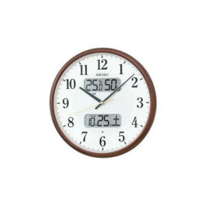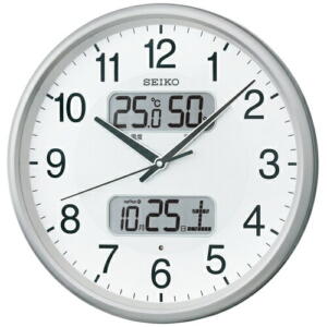 セイコー 電波掛時計【KX383S】 (SEIKO CLOCK) 電波掛時計 KX383S オフィスでも家庭でも大活躍 カレンダー、温度・湿度表示つき電波掛時計 枠材 プラスチック枠 (銀色メタリック塗装 ) 前面:ガラス サイズ・重さ 直径350x52mm 1.2kg 電池 単3(アルカリ)×2 (電池寿命約1年間) 機能 ・電波修正機能(40kHz/60kHz自動選局・受信OFF機能つき) ・2099年までのフルオートカレンダー機能 ・温度・湿度表示 温度測定範囲:0℃〜40℃ 測定精度:±2℃ 湿度測定範囲:20%RH〜90%RH 測定精度:±10%RH(25℃) ・電池切れ予告機能(秒針停止/液晶) ・ステップセコンド ・ おやすみ秒針(光センサーによる自動秒針停止機能)