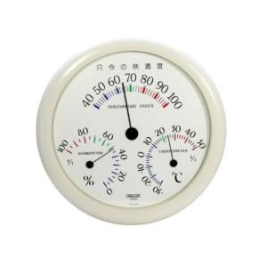 ■商品内容広い室内の温度・湿度の管理に最適。一目で室内の快適さが分かります 【不快指数】 気温というのは温度の高低で決まりますが、実際に体が感じる温度は気温通りではありません。 例えば夏に連日気温30℃なのに、昨日と今日では暑さの感じ方が違うということがあります。 この暑さの感じ方を「体感温度」と言い、「気温」「温度」「風」の3要素に左右されます。 不快指数計はこの中の「気温」と「湿度」を組み合わせて数値を表したものです。 【基準となる数値】 55以下:寒い 55〜60:肌寒い 60〜65:何も感じない 65〜75:快適 70前後:最も快適 75〜80:不快感を持つ人が出始める 80〜85:半数以上の人が不快 85以上:全員不快■商品スペック【サイズ】φ300×41mm【重量】700g【材質】プラスチック【製造】日本製【カラー】ホワイト■送料・配送についての注意事項●本商品の出荷目安は【3 – 8営業日 ※土日・祝除く】となります。●お取り寄せ商品のため、稀にご注文入れ違い等により欠品・遅延となる場合がございます。●本商品は仕入元より配送となるため、沖縄・離島への配送はできません。[ CF-310 ]
