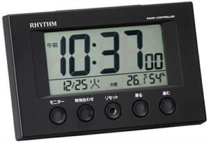 デジタル・ブラック 7.7×12×5.4cm 8RZ166SR02・・Color:ブラック・サイズ:7.7×12×5.4cm・本体重量:約0.17kg・使用電源:単3形マンガン乾電池×2本(別売り)・ムーブメント:電波時計・電波サーチ機能/止めてもまた鳴るスヌーズ機能&アラームオートストップ機能説明 コンパクトサイズながらも前面スイッチで使いやすくなっています。 温湿度計とカレンダー・六曜も搭載のハイスペックモデル。