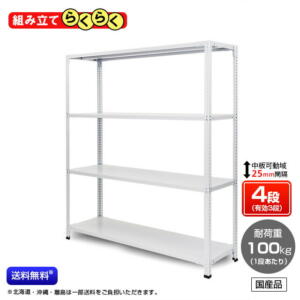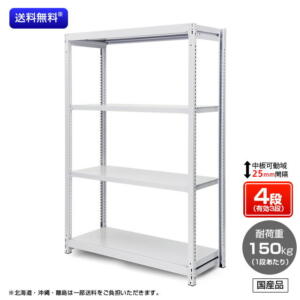 サイズ 高さ 横幅 奥行 表記寸法 1200 1200 300 外寸法 1205 1200 300 棚板寸法 1120 270 ※設置場所は外寸法+50mm位の余裕をもって下さい。 ● 均等耐荷重 1960N【200kg/段】 ※棚板1枚あたり ● 色 ネオグレー色 メラミン焼付塗装 ● 生産国 日本 ISO認定工場生産品 ● 棚板の厚さ 35mm ● 中板取付幅 25mm ● 自重 42kg ● 出荷の目安 1週間程度 ※在庫がある場合 ● 梱包内容 C型支柱 x 4本樹脂ベース x 4個スチール棚板 x 6枚ビーム x 4本天棚受 x 2本棚受 x 10本抜け止めピン x 8本組立・取扱説明書 x 1枚 ● 商品説明 組立にボルトを一切使用しないボルトレススチール棚です。支柱は4回曲げのC型(コの字)形状の支柱ですので、上からの加重にはもちろん横からのねじれにも強い構造になっています。ボルトレス棚は横連結が可能ですので、横に連結してご使用になる場合は、2台目からは増連型をご購入下さい。【個人のお客様もご購入頂けます。業務用スチールラック・スチール棚】上の画像2つは棚板5枚仕様です。
