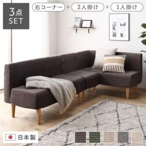 日本製 ダイニングソファ 3点セット 右コーナー+2人掛け+1人掛け コーデュロイチャコールグレー ナチュラル脚 ポケットコイル【代引不可】