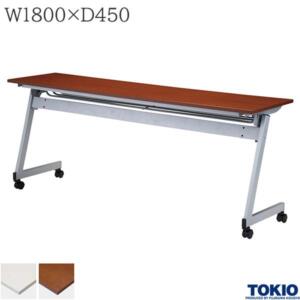 KT-1100M55N3のサイズは、幅1800mm、奥行450mm、高さ720mmです。 天板は1枚で、配線機能はありません。 天板素材はメラミン化粧板、エッジはスクエアエッジです。 脚部はT字脚と角脚の組み合わせで、キャスター付きです。 スタッキング収納が可能で、幕板や棚はありません。
