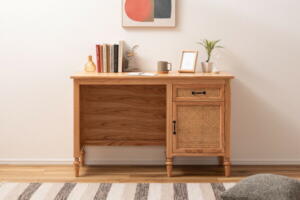 パソコンを使ったデスクワークにも、資料や教科書を広げての勉強机としても使いやすい、余裕のあるサイズ感です。●自然な木目が美しい天然木 ミンディ材使用