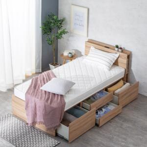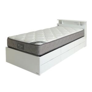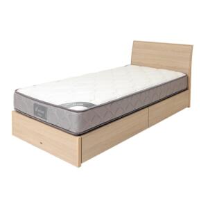 ベッド下には引き出し収納を設けており、スムーズに動く3段レール仕様で衣類やリネン類をすっきり収めることができます。寝具だけでなく小物類の収納場所も確保できるので、限られた住空間を有効に活用できます。