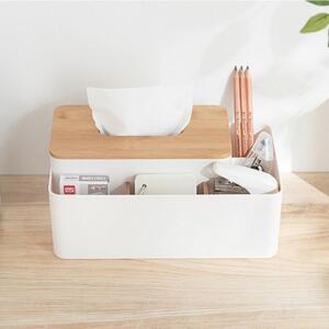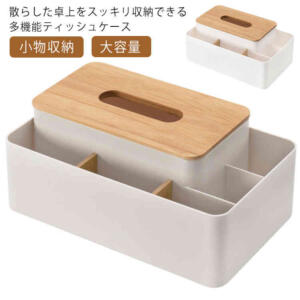 ティッシュと小物をまとめて収納できて便利なマルチ収納ティッシュケースは底上げしてくれるバネがついているので残量が少なくなっても取り出しやすくて快適10.5×20.5cmまでのソフトケースティッシュが収納可能です。サイドポケットは仕切りが取り外し可能なので収納したいアイテムにあわせて調整できます。ウッド製の蓋がインテリアのアクセントになり、ナチュラルで優しい雰囲気をプラスしてくれます。リビングやキッチンだけでなく、洗面やコスメ、オフィス用品の収納にも大活躍します。カラー:ホワイト、グレージュサイズ:26.5×15.2×12cm重量:約550g材質:プラスチック、竹※この商品はソフトティッシュ専用です。ボックスティッシュには対応していません。