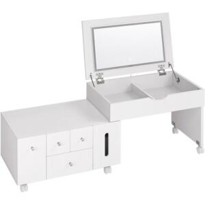 ドレッサー 鏡台 伸縮式コスメワゴン ワイド 鏡付き 可動式ミラー LED 女優ライト付き 幅67-122.5cm ほぼ完成品