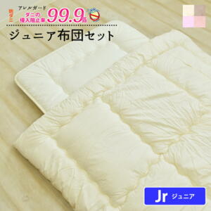 ※こちらは【掛け敷き布団セット】のご注文ページです。 (掛け布団・敷き布団・掛けカバー・敷きカバー以外のものは付属しません。) ※以前販売していた仕様の商品は終了しました。 商品詳細 サイズ ジュニアサイズ [掛け布団]135×185cm [掛けカバー]135×185cm [敷き布団]85×185cm(厚み約7cm) [敷きカバー]90×190cm 素材 【側生地】 [布団]綿100%(200本打ち込み) [カバー]綿100% 【中わた】 [布団]ポリエステル100%(テイジンの防ダニ・抗菌防臭わた使用)※敷き布団の中芯は固わた カバーカラー レポ/グレー レポ/イエローグリーン モイ/くすみブルー モイ/くすみピンク 重量 [掛け布団]約1.3kg [掛けカバー]約0.8kg [敷き布団]約2.5kg [敷きカバー]約0.45kg 生産国 [布団]日本 [カバー]中国 お手入れ方法 [布団] ・ふとんは洗濯できません。 ・丸洗いはお避けください。 [カバー] ・洗濯機で洗濯できます。 ・洗濯ネットをご使用ください。 ・漂白剤および蛍光増白剤を含んだ洗剤のご使用はお避けください。 ・水に塗れた状態で放置したり、他の物と重ね合わせて放置せず、速やかに広げて干してください。 ・アイロンがけは色が変わる事があります。あて布をしてかけてください。 ・摩擦により色移りする恐れがありますのでご注意ください。 ・素材の特性上、多少収縮する場合があります。元の寸法に合わせて形を整えて干してください。 ・乾燥機のご使用はお避けください。 ※生産時のロットチェンジの際にカラー差異が若干ございます。 ※仕上がりには個体差があります。 ※柄のある商品は、生地の裁ち位置によって柄の出方が異なる場合があります。 ※写真の色調はモニターの機種や設定により、実際の商品と異なる場合があります。 メーカー希望小売価格はメーカーカタログに基づいて掲載しています