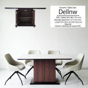 【送料につきまして】 システム上、全ての地域で【送料無料】と表示されますが、 配送先が北海道・東北地区のお客様は、北海道(13,000円)、東北地方(12,000円)の別途運賃が加算となります。 選択肢より配送地域をお選び頂けますようお願い致します。 沖縄・離島が配送先のお客様には、後ほど【当店からの注文確認メール】にて追加送料のお見積りを改めてご案内させていただきます。 【組立設置サービス(有料)につきまして】 組立設置サービスをご希望の場合は、別途お見積り致しますのでご購入前に当店までお問い合わせ下さいませ。 組立設置サービスは商品の開梱・設置・組立・梱包資材引取りまでを行う安心安全なサービスです。 ※お問い合わせの際にお客様のお住まいの地域をお知らせ頂きますとスムーズにご案内致します。 (一部の地域ではお引受け出来ない場合がございます 。) サイズ (テーブル) ・幅 140cm ・奥行き 80cm ・高さ 73cm (チェア) ・幅 53cm ・奥行き 57cm ・高さ 77.5cm(座面まで43cm) 材質 ・セラミックトップ/MDF ・強化紙 ・座面:PVC(合成皮革) ・脚:スチール 備考 チェア : 回転式チェア(オートリターン機能) 天板下が収納棚になっており、とっても便利なダイニングテーブル [機能性に優れたセラミック天板のダイニングテーブル] 毎日の食事で使うダイニングテーブルは、どんなに気をつけて使っていても長く使っていれば、 食器の擦れキズがついたり、凹んだり、水や油汚れのシミができてしまいます。 そのような問題に着目し、セラミック素材の「強さ」を活かしたダイニングテーブルが生まれました (1)熱に強い 高温のフライパンや鍋を直接置いても、変色や変形はありません。 (2)キズや磨耗に強い 表面硬度が高く、金属などでこすってもキズが付きにくくなっています。 (3)汚れや水滴が染み込まない 調味料や薬品などが染み込まないので軽く拭くだけでお手入れできます。 (角や端に強い力や衝撃を加えないでください。割れ、欠けの原因になります。 ご注意ください。)