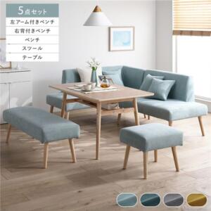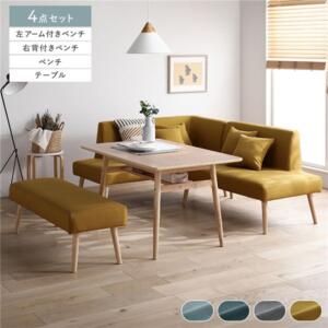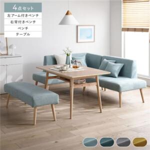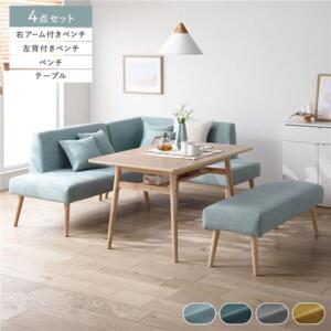 ■サイズ・色違い・関連商品関連商品の検索結果一覧はこちら■商品スペック■サイズ(約)テーブル:幅120×奥行75×高さ66cm背付きベンチ(左右共通):幅120×奥行65×高さ73cm(座面高41cm)アーム付きベンチ(左右共通):幅140×奥行65×高さ73cm(座面高41cm)ベンチ:幅120×奥行45×高さ41cmチェア:幅60×奥行65×高さ73cm(座面高41cm)スツール:幅50×奥行45×高さ41cmクッション:幅35×奥行35cm ※背付き・アーム付きベンチは2個、チェアは1個付いています。 ■材質・テーブル 天板:オーク突板・積層合板(ウレタン塗装) 脚:ラバーウッド(ラッカー塗装)・その他(背付きベンチ・アーム付きベンチ・ベンチ・チェア・スツール共通) 本体:パイン・ポプラプライドウッド・ウレタンフォーム・わた(ポリプロピレン・PP) 脚:ラバーウッド(ラッカー塗装) カバー:イエロー:ポリエステル100%/その他カラー:ポリエステル95%、ナイロン5%■耐荷重(約)テーブル:20kg背付きベンチ:160kgアーム付きベンチ:160kgベンチ:160kgチェア:80kgスツール:80kg■梱包サイズ・重量(約) ※左カウチスタイル、右カウチスタイル共通になります。3点セット(テーブル+背付きベンチ+アーム付きベンチ):(1)124×79×16cm・26kg、(2)121×66×31cm・25.5kg、(3)141×66×31cm・32kg4点セット(テーブル+チェア2脚+ベンチ):(1)124×79×16cm・26kg、(2)61×66×31cm・13.5kg、(3)61×66×31cm・13.5kg、(4)134×46×17cm・14kg4点セット(テーブル+背付きベンチ+アーム付きベンチ+ベンチ):(1)124×79×16cm・26kg、(2)121×66×31cm・25.5kg、(3)141×66×31cm・32kg、(4)134×46×17cm・14kg5点セット(テーブル+背付きベンチ+アーム付きベンチ+ベンチ+スツール):(1)124×79×16cm・26kg、(2)121×66×31cm・25.5kg、(3)141×66×31cm・32kg、(4)134×46×17cm・14kg、(5)64×46×17cm・6.7kg■生産国中国■商品に関するご注意・こちらは『4点セット(テーブル+チェア2脚+ベンチ)』の販売ページになります。背付きベンチやアーム付きベンチ、スツールは付属しません。・本製品はお客様組立品です。背付きベンチとアーム付きベンチ、チェアの組み立て時には、プラスドライバーをご用意ください。 ‐2人以上での組み立てをおすすめします。 ‐商品の組み立て開始前に部材不足、破損がないか必ずご確認ください。・ダイニングテーブルはアイロン台として使用することはできません。 天板の素材が高熱により変形・変色する恐れがあります。・直射日光または熱を避けてご使用ください。・火気ストーブなどの近くに置かないでください。・ベンチやチェア、スツールの上に立ったり、踏み台として使用しないでください。また、座面以外のところに座らないでください。・転倒して怪我をする恐れがあります。平らな所で使用してください。・ウッドフロアや畳などの上でベンチやチェア、スツールを使用する場合は、床面にキズがつかないようにカーペット等を敷いてください。・製造の都合上、粉塵のようなものが付着している場合がございます。 人体に影響のあるものではございませんが、気になる場合は乾いた雑巾等で乾拭きをしてご使用下さい。・写真の色調はモニターの機種や設定により実際の商品と異なる場合があります。・製品のデザイン・仕様・梱包は予告なく変更することがございます。あらかじめご了承ください。・本品を壁につけて設置すると壁に傷をつけたり、色移りやカビが発生する可能性があります。必ず少しすきまを開けて設置してください。・家庭でのご使用を目的としています。業務用でご使用しないでください。・カバーを洗濯の際には、洗濯表示にしたがってお手入れをお願いいたします。・本体、クッション中材は洗濯できません。・開封した際に、製造時に使用した塗料や接着剤の臭気が残っている場合があります。化学物質に敏感な方はまれにアレルギー症状を起こす場合もありますので、開封直後は部屋の換気を十分に行ってください。よく絞った布で水拭きすると臭いが軽減される場合もあります。・天然素材を使用している製品は、天然材質の特徴により1品1品風合いが異なる場合がございます。商品画像と風合いが異なる場合がございますので、予めご了承ください。・付属の脚以外を使用しないでください。破損や怪我の原因になります。・画像や商品情報には、色違いやセット・スタイル違いの商品が載っている場合がございます。ご注文前に色・セット・スタイル内容のご確認をお願いいたします。・背付きベンチとアーム付きベンチの右・左は座った時にどちらの位置に背もたれ・アームがあるかになります。■保証期間及び保証内容・保証期間:購入日から1年間対応。・保証内容:【取扱説明書(同梱)】に従った通常使用の範囲内で起こった 不良品についてのみ、メーカーの判断に基づき良品交換対応をさせていただきます。※誤使用や通常使用の範囲外で発生した破損・傷・汚れや、お客様都合による返品交換は致しかねます。※保証は日本国内においてのみ有効です。※業務用に利用された場合、保証の対象外となります。【配送上のご注意】・本商品は大