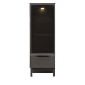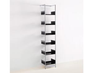 縦に伸びる細長い矩形のフォルム。4段引き出し棚。 引き出しに寄り添うように縦に細長いスライド式の特別な引き出しは小物入れと鏡が収納されています。