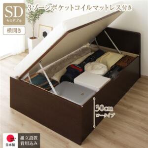 〔組立設置サービス付き〕 収納 ベッド 通常丈 セミシングル 跳ね上げ式 縦開き 深さ30cm ロータイプ 3ゾーンポケットコイルマットレス付き アイボリー ヘッドレス 日本製 国産【代引不可】