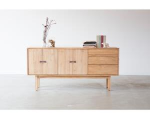 寝室にもリビングにも設置しやすい、シンプルでやさしい印象のサイドボード。節ありのオーク材による木の豊かな表情に加えて、天板や側板、扉など随所に丸みをもたせていることで、温もりある印象を与えます。取手の真鍮パーツがナチュラルな中に高級感を感じさせるアクセントになっています。