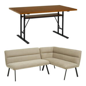 ヴィンテージスタイル・リビングダイニングセット【CISCO】シスコ■テーブル(W120/W150)【サイズ】幅120/150×奥行80×高さ64cm【材質】 天板:天然木化粧繊維板(ウォールナット) 仕上げ:ウレタン塗装 脚:スチール【製品重量】20kg/23kg【梱包数】2【梱包サイズ/梱包重量】 W120:幅124×奥行84×高さ5cm/15kg W150:幅154×奥行84×高さ5cm/18kg 脚部:幅67×奥行79×高さ15cm/ 8kg 【生産国】ベトナムまたは台湾 ※組立品■ソファ2P 【サイズ】幅119×奥行71×高さ73cm(座面高37cm) 【材質】 張り地:合成皮革(PVCレザー) クッション材:Sバネ、ウェービングベルト、ウレタンフォーム 脚:天然木(ラバーウッド)【製品重量】16kg【梱包数】1【梱包サイズ/重量】 幅130×奥行72×高さ62cm/18kg【カラー】バイキャストブラック【生産国】中国 ※組立品 ■アームソファ2P(※左右共通サイズ)【サイズ】幅141×奥行71×高さ73cm(座面高37cm)【材質】 張り地:合成皮革(PVCレザー) クッション材:Sバネ、ウェービングベルト、ウレタンフォーム 脚:天然木(ラバーウッド)【製品重量】25kg【梱包数】1【梱包サイズ/重量】 幅142×奥行71×高さ58cm/27kg【カラー】バイキャストブラック【生産国】中国 ※組立品 ■ベンチ(W120)【サイズ】幅120×奥行46×高さ37cm、【材質】 張り地:合成皮革(PVCレザー) クッション材:Sバネ、ウェービングベルト、ウレタンフォーム 脚:天然木(ラバーウッド)【製品重量】10kg【梱包数】1【梱包サイズ/重量】 幅131×奥行48×高さ20cm/12kg【カラー】バイキャストブラック【生産国】中国 ※組立品 ■チェア1P【サイズ】幅47×奥行71×高さ73cm(座面高37cm)【材質】 張り地:合成皮革(PVCレザー) クッション材:Sバネ、ウェービングベルト、ウレタンフォーム 脚:天然木(ラバーウッド) 【製品重量】9kg【梱包数】1【梱包サイズ/重量】 幅57×奥行72×高さ50cm/11kg【カラー】バイキャストブラック【生産国】中国 ※組立品 ■オットマン【サイズ】幅51×奥行51×高さ37cm【材質】 張り地:合成皮革(PVCレザー) クッション材:Sバネ、ウェービングベルト、ウレタンフォーム 脚:天然木(ラバーウッド) 【商品重量】9kg【梱包数】1【梱包サイズ/重量】 幅62×奥行52×高さ24cm/10kg【カラー】バイキャストブラック【生産国】中国 ※組立品_______________________________■3点セット:テーブル、ソファ、アームソファ■4点ベンチセット:テーブル、ソファ、アームソファ、ベンチ■4点チェアセット:テーブル、ソファ、アームソファ、チェア■4点オットマンセット:テーブル、ソファ、アームソファ、オットマン■5点チェア・ベンチセット:テーブル、ソファ、アームソファ、ベンチ、チェア ※サイズ・重量は概算です。※実際の商品の色にできるだけ近づけるよう撮影を行っておりますが、 商品色はご使用のモニターによって実際の明るさや色と多少異なって見える場合が ございます。また、こちらの商品は天然木を使用した商品のため一点一点木目が異なります。※仕様は予告なく変更になる場合がございます。予めご了承下さい。【 ダイニングテーブルセット ダイニングセット 】 ヴィンテージスタイル リビングダイニングセット CISCO シスコ 5点セット(テーブル+ソファ1脚+アームソファ1脚+チェア1脚+ベンチ1脚)右アーム W120 ダイニングセット テーブル ダイニング 木 木製 要組立品▼セットを選ぶ▼(テーブル+ソファ1脚+アームソファ1脚)3点セット(テーブル+ソファ1脚+アームソファ1脚+ベンチ1脚)4点セット(テーブル+ソファ1脚+アームソファ1脚+チェア1脚)4点セット(テーブル+ソファ1脚+アームソファ1脚+スツール1脚)4点セット(テーブル+ソファ1脚+アームソファ1脚+チェア1脚+ベンチ1脚)5点セット (現在表示中)▼サイズを選ぶ▼右アーム W120 (現在表示中)▼組立設置サービス 有・無 を選ぶ▼お客様にて組立 / 要組立品 (現在表示中) 組立設置サービス付