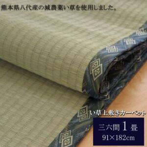 ■サイズ・色違い・関連商品■本間1畳 約95×191cm[当ページ]■本間2畳 約191×191cm■本間3畳 約191×286cm■本間4.5畳 約286×286cm■本間6畳 約286×382cm■本間8畳 約382×382cm■本間10畳 約477×382cm関連商品の検索結果一覧はこちら■商品内容熊本県八代産減農薬栽培イ草100%使用の上敷きです。特徴として(1)一般のイ草に比べ耐久性や弾力性に優れイ草特有の青さも長持ちします。(2)日焼けして退色が進んでもきれいなアメ色へと変化します。(3)大気汚染の原因にもなっている二酸化窒素を吸収する能力があり、またお部屋の湿度調整にも優れた働きをします。上敷きを敷くだけで畳のお部屋をリフレッシュ出来ます。日焼けしてしまった畳のリフレッシュに、新品の畳を汚さないためのカバーにご使用下さい。通常畳表に使用される長さ130cm以上【JAS1クラス(畳表の中でも上クラス)】の国産(イ草の産地熊本県八代産)い草を使用しています。厳選された良質の太く長いイ草を高密度に織り込んでおりますので、丈夫で耐久性があり、素肌に心地よいボリューム感があります。長さ130cmのうち約88cmを使用しています。ヘリ際の白い部分が少ない、長いイ草を使用した高級な商品です。(白い部分は日焼けではありません、い草の根元と先端部分の色です。)い草は長いものほど高級になります。い草は先端部分が赤茶色く、根元が白く真中が青(緑)色です。真中の良質な青の部分を多く使用するほど、丈夫で綺麗な仕上がりとなります。またイ草は使用するうちに日焼けをしますが、真中の青の部分を多く使用したものほど、全体が綺麗にムラなく日焼けし、味が出ます。こちらの商品は畳表と同じ織り方の糸引織で仕上げました。双目織りと比べて、い草の打ち込み本数が多いため丈夫です。表面が滑らかなので、ホコリなどがたまりにくいのが特徴です。長くご使用されたい方や、耐久性をお求めの方には糸引織をおすすめします。国産(熊本県八代産)のい草を使用しています。国産い草は一本一本が太く、表皮が厚く繊維がキメ細かいので弾力性があり、耐久性に優れています。い草には空気の清浄化作用、湿度の調節作用があり、汚れにくいといった特徴があります。青森県のヒバの木から抽出した「ヒバエッセンス」をメーカー独自の技術で生地表面に加工しました。ヒバエッセンスにはヒノキチオールという、天然物質としては極めて抗菌性の高い成分が含まれています。(無加工品に比べ抗菌、防臭効果があります。)表裏の両面が使えて経済的です。※自然素材であること、また職人が一つ一つ手作業にて加工を行うため、形状のバラツキや表示サイズと多少異なることがあります。ご了承下さい。■商品スペック【サイズ】約95×191cm 本間1畳【カラー】ナチュラル【原産国】日本製(純国産)【素材】い草(熊本県八代産) ※糸引織ヘリ:ポリプロピレン、ポリエチレン【配送日時指定について】・この商品は、配送希望日と時間帯をご指定可能です。・配送希望日は出荷目安(最長)の 3 – 30 日後の間でご指定ください。・最短でのお届けをご希望の場合は「指定なし」を選択してください。※配送エリア(例:沖縄・離島)により、配送希望日のご指定をお受けしかねる場合がございます。■送料・配送についての注意事項●本商品の出荷目安は【4 – 6営業日 ※土日・祝除く】となります。●お取り寄せ商品のため、稀にご注文入れ違い等により欠品・遅延となる場合がございます。●本商品は仕入元より配送となるため、北海道・沖縄・離島への配送はできません。