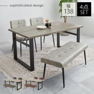 商品サイズ(外寸):テーブル:(約)幅138×奥行80×高さ70cm、チェア:(約)幅52×奥行55×高さ75.5×座面高42cm、ベンチ:(約)幅100×奥行38×高さ42×座面高42cm内寸及び補足説明:■組立式■アジャスター付成分材質:天板:合成樹脂化粧繊維板(メラミン樹脂)、脚部:スチール、張地:合成皮革コンクリート調のテーブルに細身なシルエットで特徴的なZ型のフレームを使用したチェアを合わせたダイニングセット。張地はヴィンテージ感のあるエイジング加工をした色合いです。LT4771GY51DGY4S