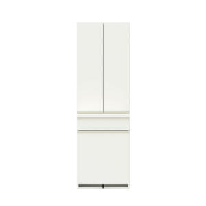 本体には天然木のリアルな木目を表現した強化紙を使用。汚れや摩耗に強く、建材にも使用される素材です。色ブレや個体差がほとんどなく、シリーズで揃えていただくと統一感が出ます。割れ等も生じないため、乾燥が気になる環境にも適しています。近距離で目に触れる機会のあるガラス扉とカウンター天板前縁には無垢材を使用し、天然木の質感も感じられるつくりとなっています。