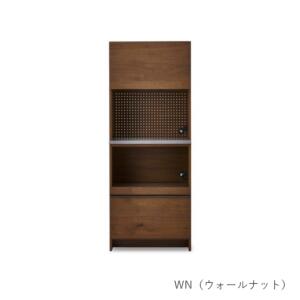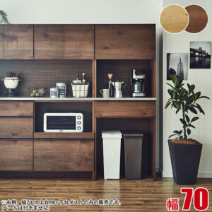 節有りの突板を使うことで高い質感を出した食器棚です。家電収納として使いやすいレンジボードの上部収納は、跳ね上げ式フラップ扉となっています。使用するときはオープン状態で止まるため、出し入れする際に便利な仕様です。