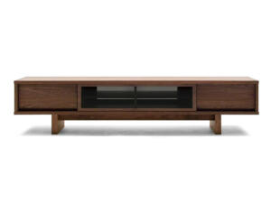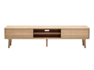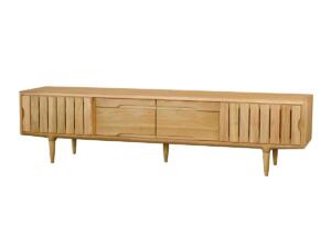 オーク材を使用した、縦ラインのスラットデザインドアが印象的なテレビボード。開放感を演出しながら、収納物を程よく目隠しし、空間にすっきりとした印象を与えます。中央のオープン棚の背面には配線孔を設けており、煩雑になりがちなAV機器のケーブル類をまとめることができます。