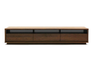 AV機器をスタイリッシュに収納できるテレビボード。天板パネルの耐荷重は50kgあるため、大型テレビを載せてもたわみません。オープン棚にはバックパネルがないため、レコーダー類の配線も容易。向かって左の扉は下方向に開き、扉を閉めると生活感を隠してすっきりとした印象でお使いいただけます。扉内は棚板がなく収納スペースを広く取っているため、レコードも縦に収納でき、市販のボックスを活用して小物類を整頓しても便利です。寝室では、ベッドの足元でフットベンチ代わりの配置もおすすめです。