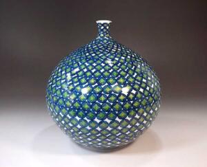 有田焼・伝統工芸・総手描き染付青海波鯛絵飾り花瓶陶芸作家 藤井錦彩 作