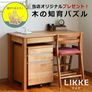 在庫有の場合は、配送予定にて納期をご確認ください。在庫切れ商品については、お問合せフォームよりお気軽にお問合せください。【デスク】幅1000×奥550/630×高730(mm)※クランプ式ライト取り付け可能エリア拡張なし:奥側45 mm拡張あり:奥側125 mm(一部不可)、横側75 mm【上棚】幅400×奥224×高300(mm)【ワゴン】幅421×奥478×高578(mm)5年間 詳しくはこちら広島にある学習机メーカーさんと開発した、当店オリジナルの学習机「LIKKE(リッケ)」。「リッケ」とはノルウェー語で “幸せ・幸福”を意味する言葉です。新たにお勉強の世界へ足を踏み入れ、成長をされるお子さまへ。幸せな時間がたくさん過ごせるようにと願いを込めた学習机シリーズです。大人になっても長く大切に使えるよう、細部までデザイン・強度にこだわり仕上げた当店の自信作です。【デスク】天板・前板・脚部:アルダー無垢材引出し内部:キリ材一部:プリント化粧合板【上棚】アルダー無垢材プリント化粧合板【ワゴン】主材:アルダー無垢材側板材:プリント紙化粧合板引出し内部材:桐材引出し底板:MDF材【デスク】天板:セラミックス塗装主材部:オイル塗装(自然塗料)【上棚・ワゴン】オイル塗装(自然塗料)・生産国 日本・塗料/接着剤 F☆☆☆☆【デスク】・重量 約20kg・フック付き 2ヶ所(左右1個ずつ)・耐荷重 フック:約10kg、天板:約30kg、拡張天板:約10kg・必要工具 プラスドライバー【上棚】・重量 約3kg・耐荷重 固定棚 約10kg 引出し 約3kg【ワゴン】・重量 約14.5kg・耐荷重 天板 約10kg 上中段引出し 約5kg 下段引出し 約10kg・上中段 スライドレール・下段 フルオープンレール・付属工具 スパナH13・個口数 3個口・こちらの商品は【組立品】です【熨斗不可】お支払い方法、送料、配送方法について詳しくまとめました。過去にお問い合わせ頂いた、よくあるご質問をまとめました。アイコン説明はこちら【GD_109】 【97-rikkeseries】【2310_p10】 【original_matset】スタディコーナー 堀田木工 ナチュラル お洒落 おしゃれ 入学準備 勉強デスク リビング ダイニング 子供部屋 学習机 ナチュラル シンプル スッキリ コンパクト デスク 天然木 ナチュラル アルダー 省スペース 木製 DESK 学習机 棚 ラック 収納 本棚 堀田木工所 hotta woody hotta-woody 高校生 中学生 小学生 スリム 国産 日本製 国産家具 組み合わせ 大人 在宅 在宅用 在宅仕事 在宅勤務 リモート 大人用デスク 大人用机 リモートデスク ワークデスク デスク周り 自宅学習 テレワーク 巣ごもり フック付 ペントレー ペントレイ プレゼント スライドレール クランプ式 クランプライト A4ファイル A4 A3ファイル A3 整理整頓 子育て 育児 新学期 【Sales_OK】商品番号 97-0186奥行きサイズを拡張できる学習机・学習デスク 3点セット 100cm幅(デスク+上棚+ワゴン)LIKKE(リッケ) デスクセット価格 86,700円(税込)シンプルデザインとサイズ拡張できる学習机3点セット LIKKE(リッケ)(デスク+上棚+ワゴン)広島にある学習机メーカーさんと開発した、当店オリジナルの学習机「LIKKE(リッケ)」。「リッケ」とはノルウェー語で “幸せ・幸福”を意味する言葉です。新たにお勉強の世界へ足を踏み入れ、成長をされるお子さまへ、幸せな時間がたくさん過ごせるようにと願いを込め作りました。子供から社会人になっても使え、ご結婚後のご家庭でもリビングテーブルや作業台等としても活用され、そのままお子様へと譲りたくなる『一生モノの学習机』として大切に想えるよう、細部までデザイン・強度にこだわり仕上げた当店の自信作です。SET1:学習デスク100cm 単品はこちらSET2:上棚 単品はこちらSET3:ワゴン 単品はこちら成長に合わせて奥行アップ通常時の奥行きは55cmとコンパクト。小さなころはリビング学習用のデスクとして。少し大きくなったら拡張し、子ども部屋での余裕のある勉強スペースに。もっと大きくなったら、コンパクトサイズに戻してPCデスクやワークデスクとして使うこともできます。拡張板が付いているので、用途に合わせて簡単にサイズアップできます。男の子でも、女の子でも、大人でも!ナチュラルでシンプルなスタイルだから、置くものやお部屋の雰囲気に合わせやすく、男の子にも女の子にも、大人の方にも使っていただけます。シンプルな4本脚デスクを作りたいシンプルさを求める中で強度への課題をどうクリアするかが重要だった為、何度も家具デザイナーと話し合い、試行錯誤によりこの度のカタチを作る事ができました。他にはないシンプルさただのまっすぐでは面白くない。家具デザイナーからの図面は、デスク細部にちょっとしたアクセントとして、角度や丸みを付ける事。言われなければわからないけど、その一工夫が上品なシンプルさにつながっています。天板塗装は少しでも強く、自然な風合いに天板は汚れや熱、紫外線にも強いセラミックス塗装で仕上げを選びました。触るとさらさらと手触りよく自然な木の風合いを残しながら、家具の美しさを長く保ちます。使い勝手の良いオススメポイント!デスク