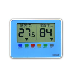 温度・湿度の状態をマークが点滅してお知らせ 卓上スタンド・壁掛け用穴・ストラップホールあり 測定範囲 温度:-9.9〜50℃/湿度:20〜95%Rh 精度 温度:±1.5℃/湿度:±10% 測定感覚:約10秒 電源:単4乾電池 1本 56×74×16mm 50g