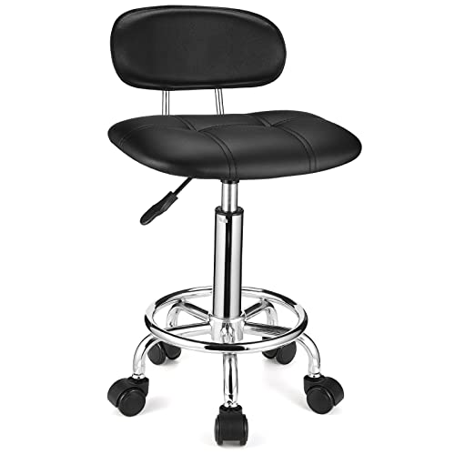 HMTOT ホイールブラック付きバックレスト高さ調節可能なスイベルスツール付きのスクエアローリングスツール